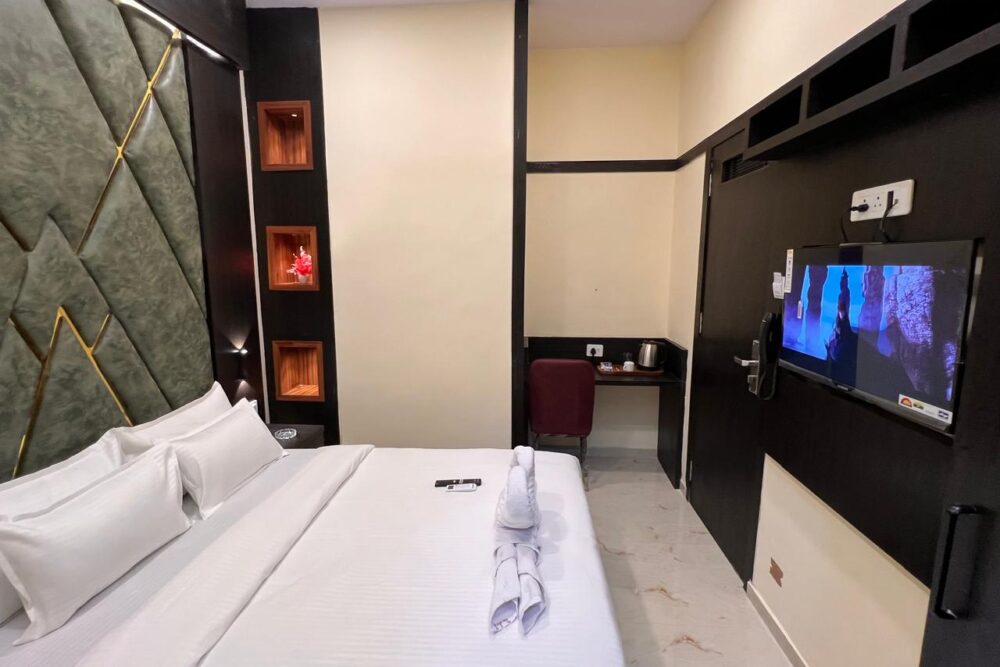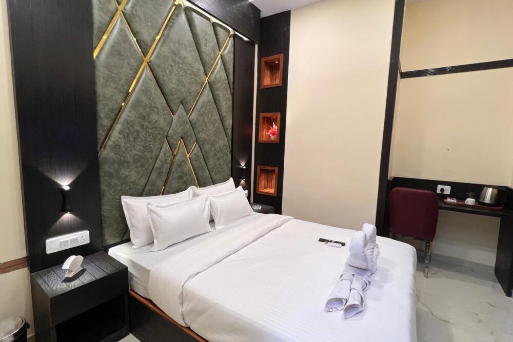 Deluxe Room at Hotel Skyline Suite offers elegant comfort for two guests. Located near Mumbai International Airport, this air-conditioned room includes a double bed, free Wi-Fi, attached bathroom, LED TV, and 24-hour room service.
